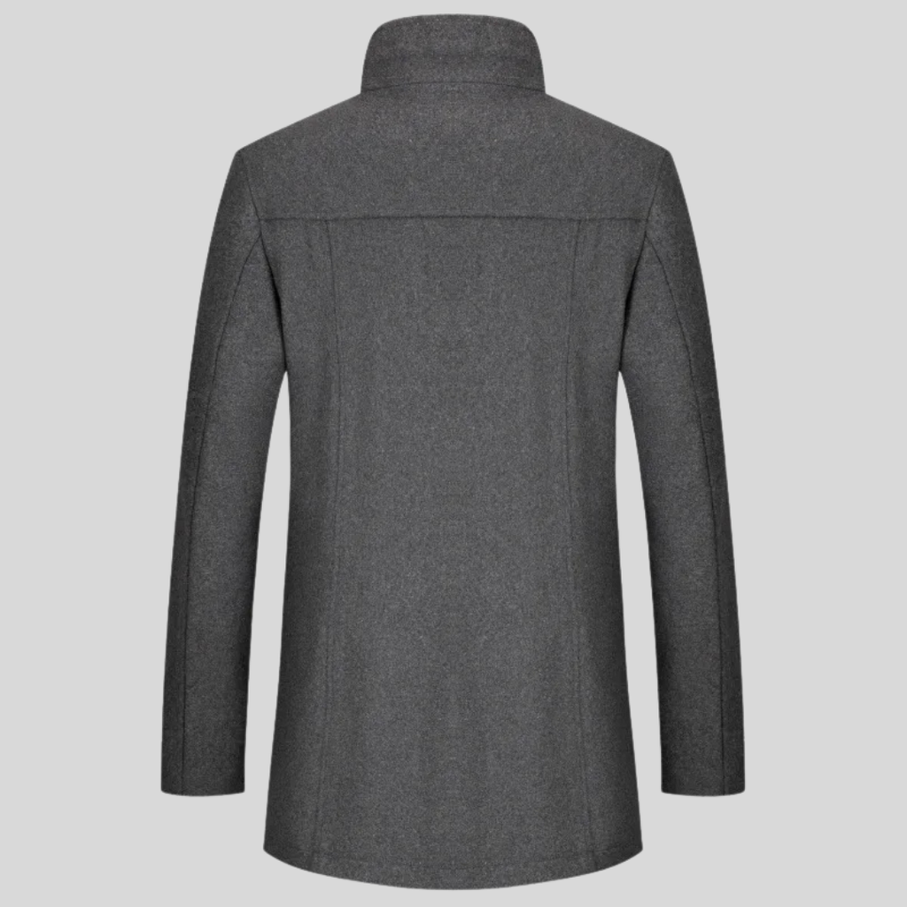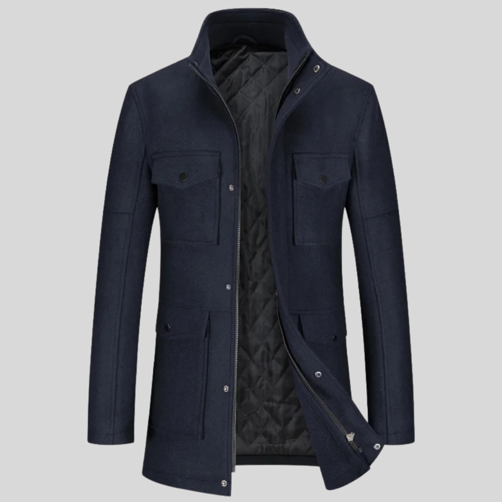 A smart casual field jacket in a wool-polyester blend with quilted polyester lining. Features a mandarin collar with ribbed knit insert, full zip closure with snap placket, and four functional pockets. Dual chest flap pockets and lower patch pockets provide ample storage. The quilted lining adds insulation without bulk. Regular length with a tailored fit. Built for daily wear from autumn through winter.